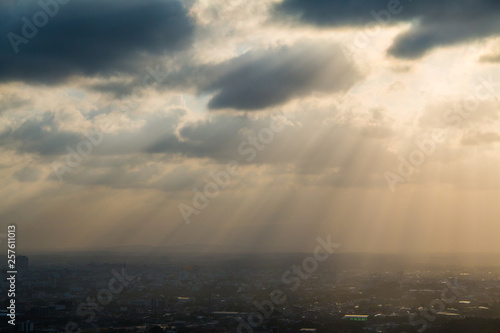 Beautiful clouds with sunshine passing through the sky at sunset.