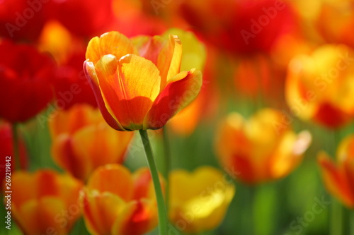 Beautiful colored red and yellow tulips on a field, postcard or greetingscard for easter and motherday