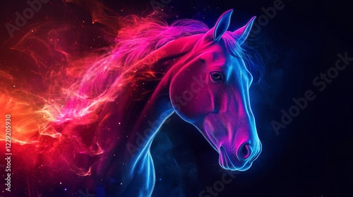 Beautiful colorful glow neon blue red pink white abstract background with magical realistic horse head beautiful black night sky background