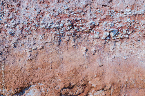 Beautiful colorful nature background in form of blue sandy coast merging to red cliff. Greece.