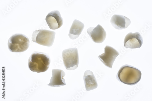 beautiful composition of dental crowns and veneers on a white background with clearance