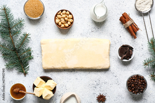 Beautiful composition with different ingredients for preparing Christmas pie on white background