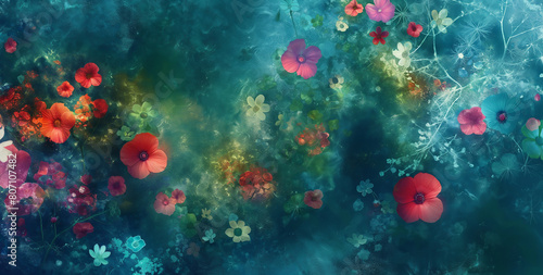 beautiful concept turquoise background with pink and red flowers, abstract forest