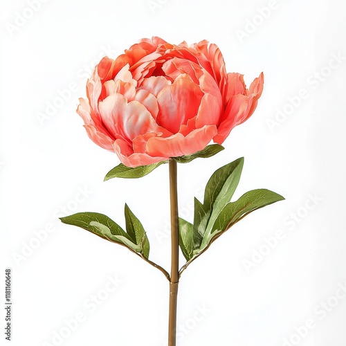 Beautiful Coral Peony Flower with Green Leaves on White Background