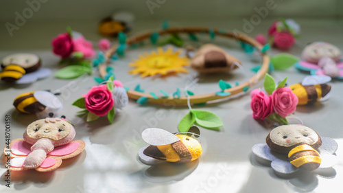 Beautiful cot mobile laid out on a tiled floor, stuffed cute bees and flowers attached to the embroidery hoop cot mobile.