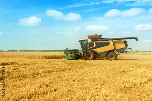 Beautiful countryside landscape .Combine harvester on a wheat field.
