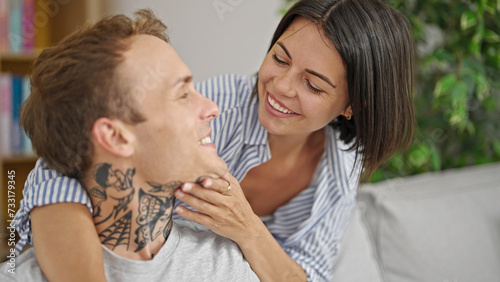 Beautiful couple hugging each other sitting on sofa smiling at home