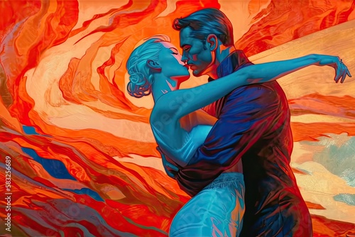 Beautiful Couple Kiss, Woman In White Dress and Man in Official Costume Dance Tango, Vivid Color Retro Vintage Illustration