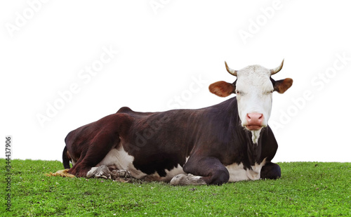 Beautiful cow resting on green grass against white background. Animal husbandry