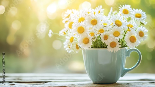 Beautiful daisies in a blue cup on a wooden table with sunlight streaming in during a tranquil afternoon