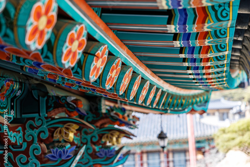 Beautiful Dancheong pattern at Haeinsa Temple, a traditional temple in Hapcheon, Korea