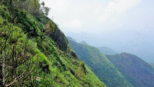 Beautiful dense green lush landscapes of kodaikanal hillstation filled with mist and cloudy sky.