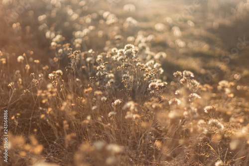 Beautiful dry grass, illuminated by the sun. View of grass at sunset