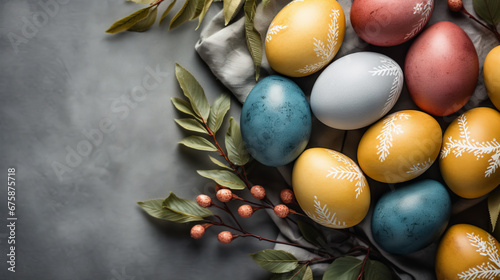 Beautiful Easter eggs and spring branches on fabric background, closeup