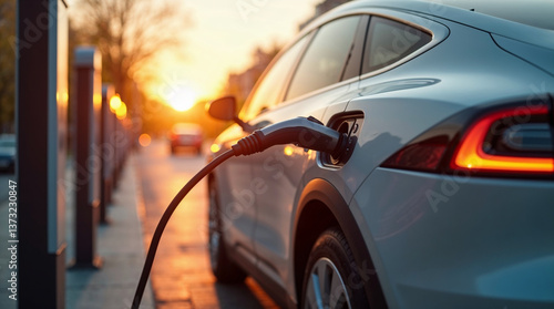 Beautiful electric car charging at a city station during sunset, showcasing sustainable transportation and modern design