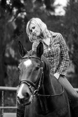 Beautiful elegance back woman cowgirl, riding a horse wearing bl