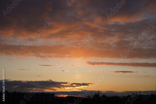 Beautiful evening blue sky at sunset with flaming bright light clouds. A warm summer evening at sunset.