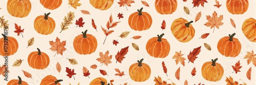 Beautiful fall pattern with pumpkins and autumn leaves for seasonal decor