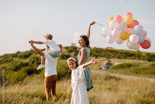 Beautiful family of four taking a walk in the green mountain fields carrying colourful baloons smiling and enjoying their holiday .