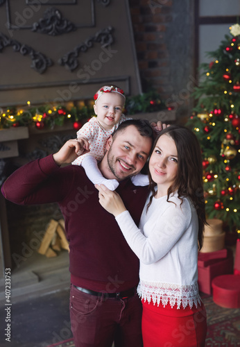 Beautiful Family with little daughter celebrate new year. Little cute girl sitting on her father's neck.