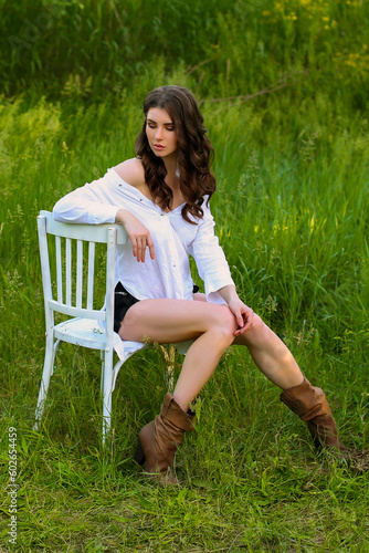 beautiful fashionable brunette woman adult posing in the park on the nature backgraund in white linen shirt, sit on the white chair