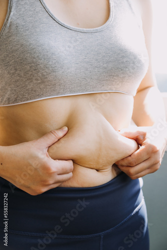 Beautiful fat woman with tape measure She uses her hand to squeeze the excess fat that is isolated on a white background. She wants to lose weight, the concept of surgery and break down fat under the