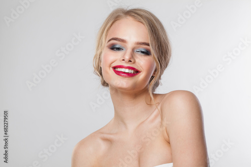 Beautiful female face. Blonde woman with long curly hair and makeup studio portrait