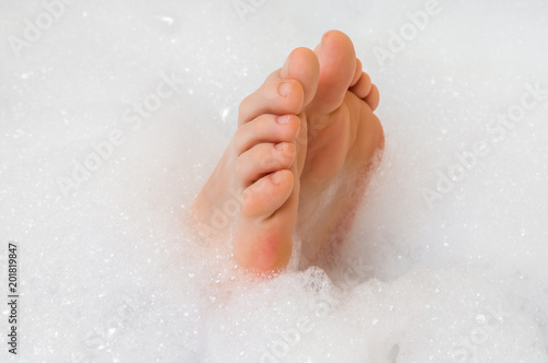 Beautiful female feet in bathtub with foam