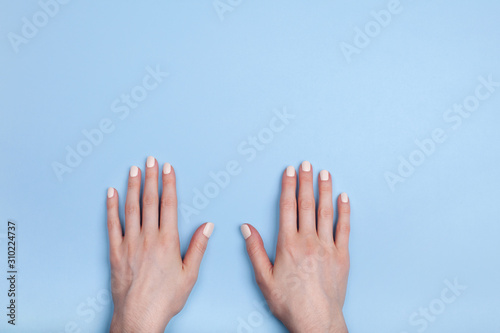 Beautiful female hands with a classic matte manicure lie on the table. Place for your text.