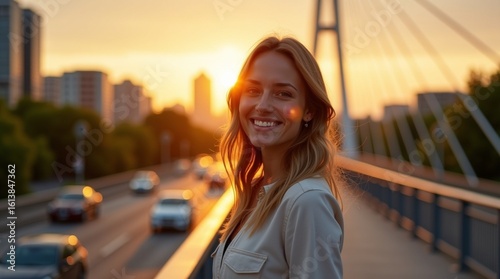 Beautiful Female Smiling on City Bridge at Sunset Traffic Background