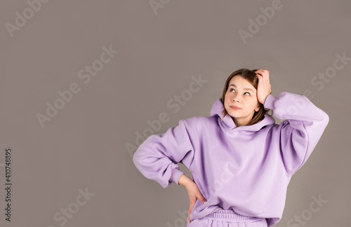 Beautiful female with puzzled expression, keeps hand on head, looks aside with bewilderment, poses against gray background. Body language and face expression