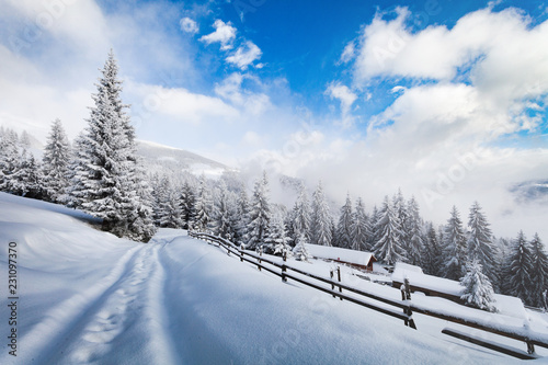 Beautiful fir tree and spruce winter landscape background