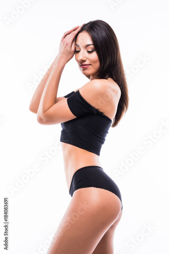 Beautiful fitness woman with a perfect body isolated on white background. Perfect woman body in swimsuit isolated.