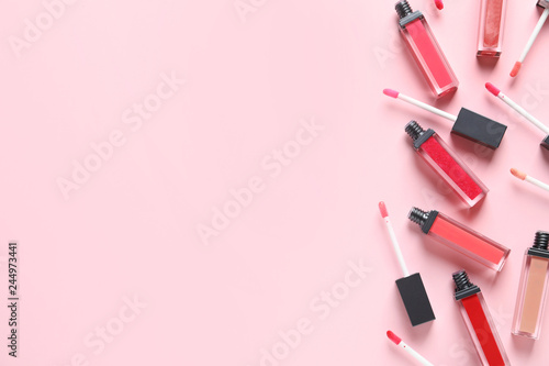 Beautiful flat lay composition of liquid lipsticks and space for text on color background