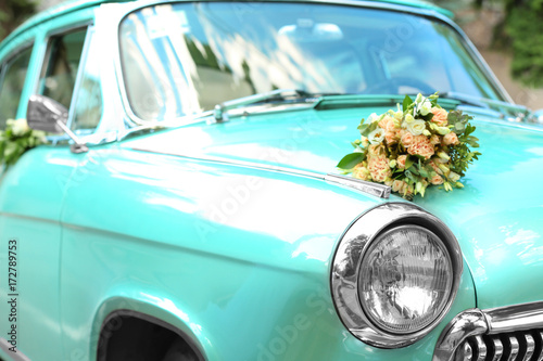 Beautiful floral decoration on wedding car