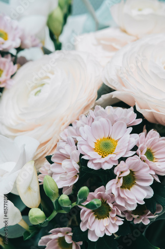 Beautiful flowers in wrapping: white big roses and wildflowers. Spring background.