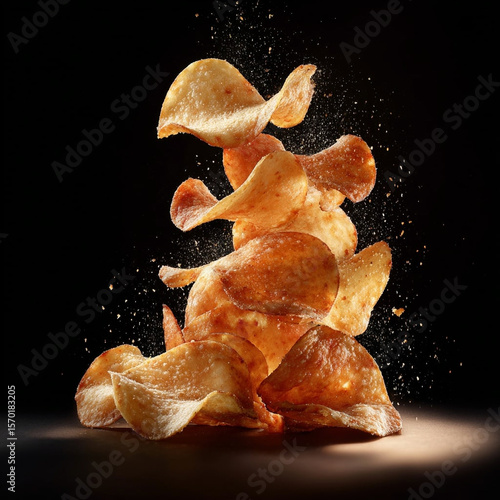 Beautiful food photography with falling crispy chips on a contrasting black background