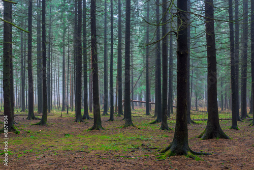 beautiful forest with tall fir trees in autumn