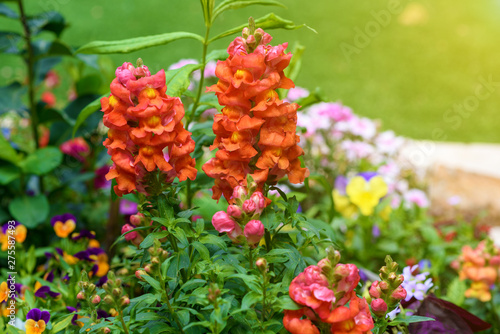 Beautiful garden flowers at sunny day. Group of pansy flowers snapdragon flower and other amazing plants.