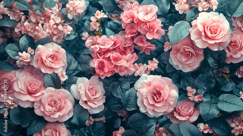 Beautiful garden scene with pink roses and flowering plants in a lush, vibrant setting