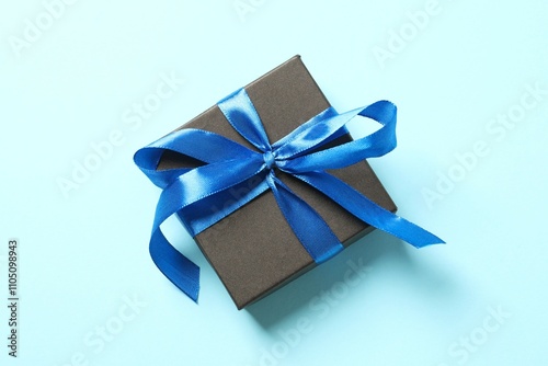 Beautiful gift box tied with bow on color background