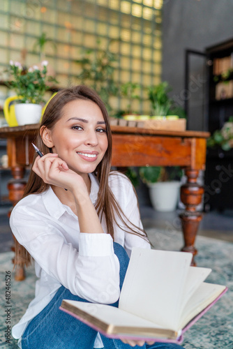 Beautiful girl designer in a dress is working making notes in a notebook