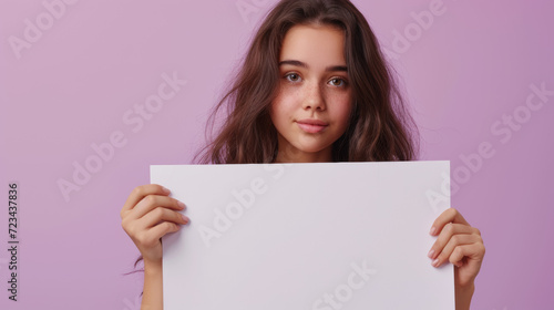 Beautiful girl holding a white mockup poster. Purple pastel backdrop.