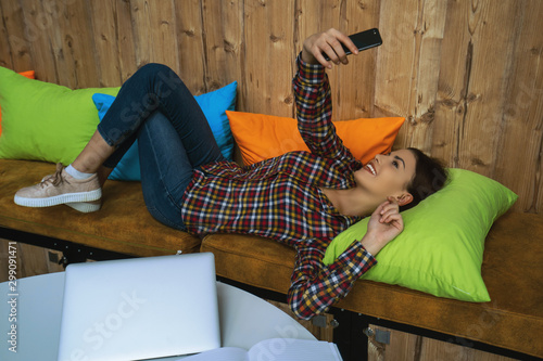Beautiful girl in casual clothes is doing selfie using a smart phone and smileing while working with a laptop in the office. Startup concept