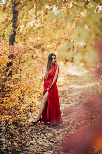 Beautiful girl in red dress standing near colorful autumn leaves. She enjoying nature.