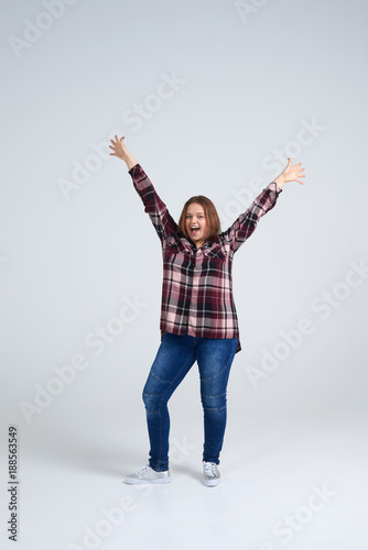 Beautiful girl in shirt and jeans holding arms outstretched