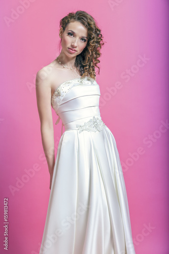 Beautiful girl in white satin dress.
