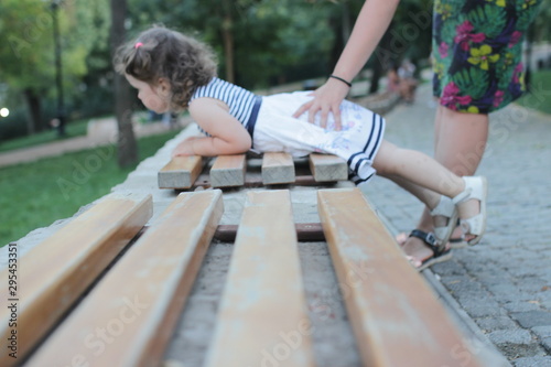 beautiful girl lies on a bench. hanging out with parents.