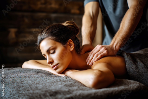 beautiful girl relaxes during a body massage in a spa salon. Man masseuse massages a young woman with hands in massage salon