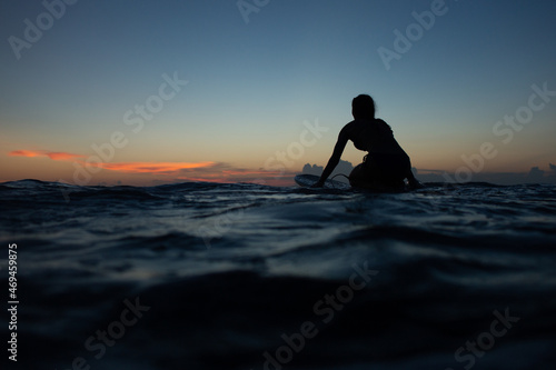 beautiful girl with a surfboard at sunset.